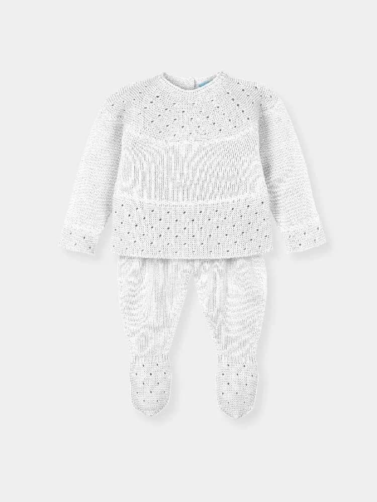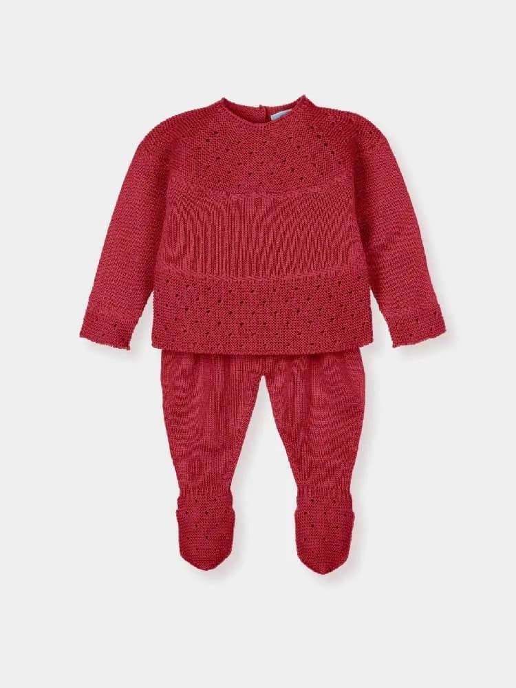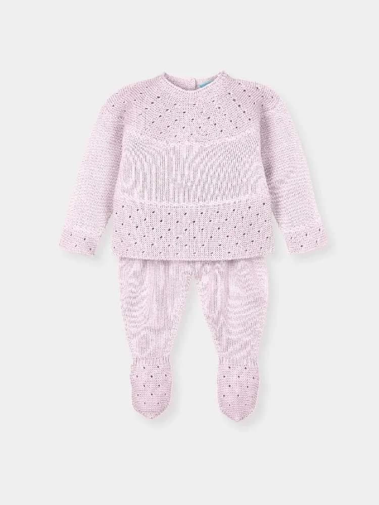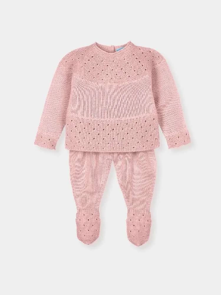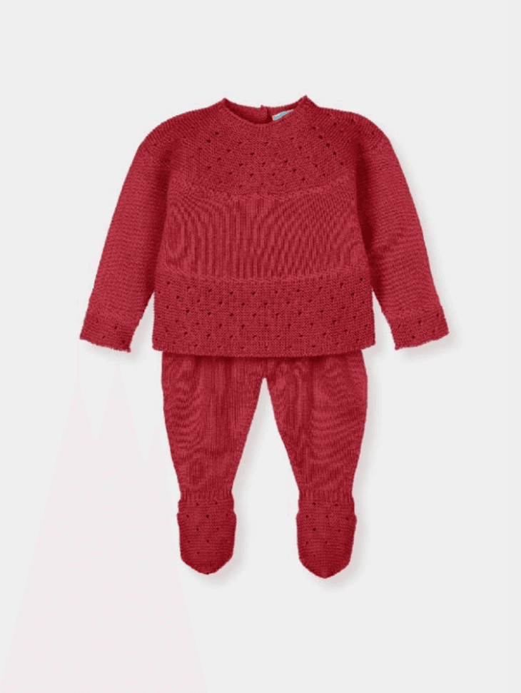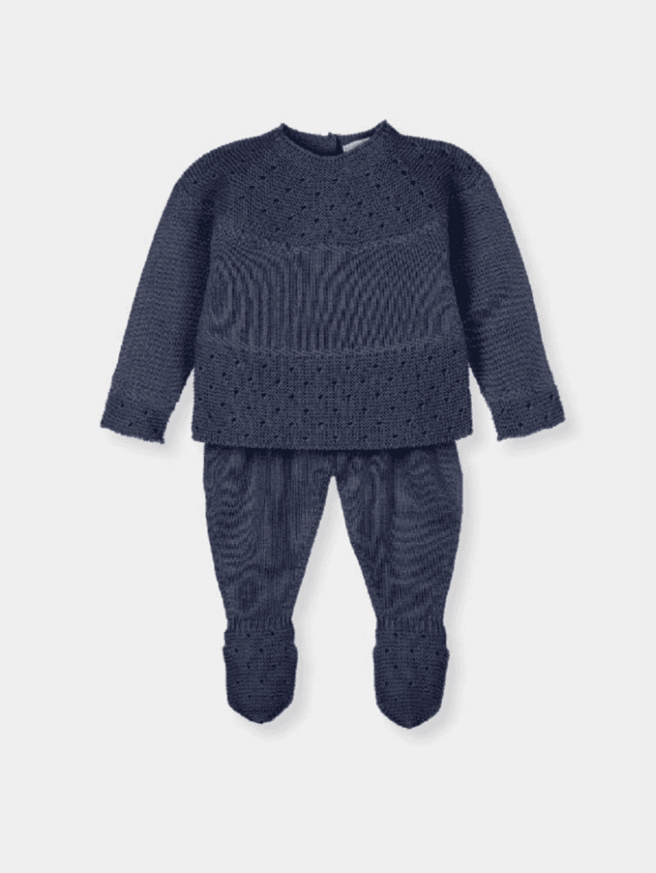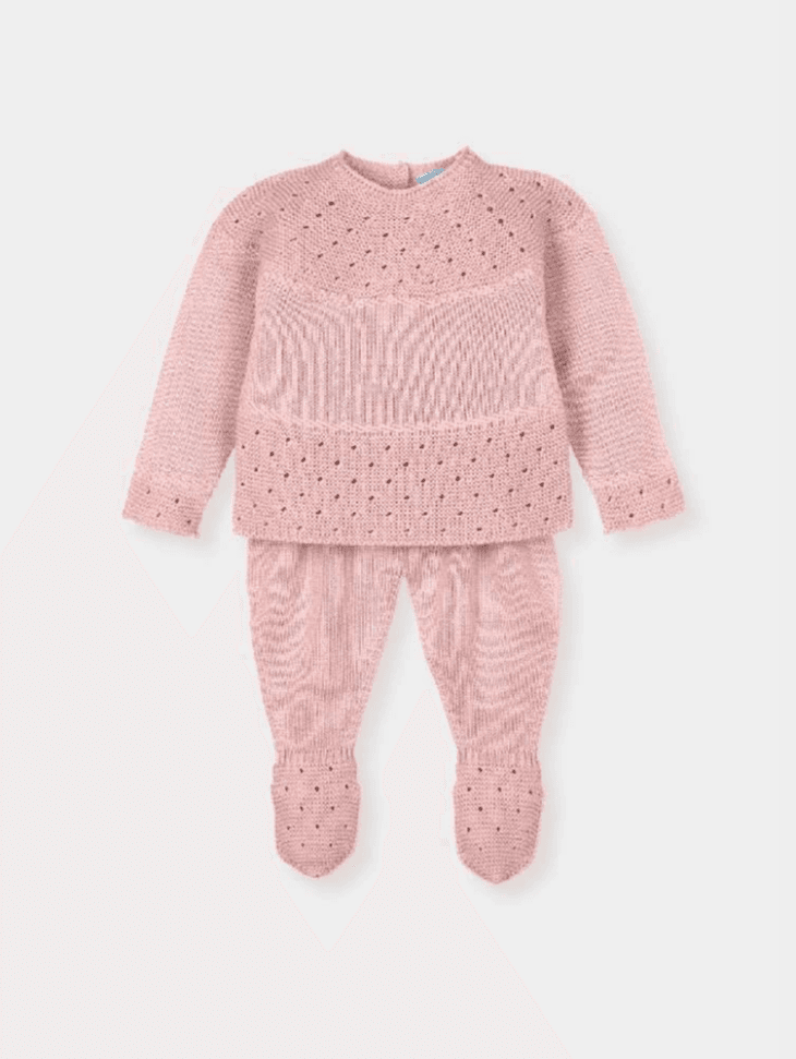 Jersey y polaina en punto calado color menta con patrón de ojales. Tejido ligero y transpirable, perfecto para entretiempo.