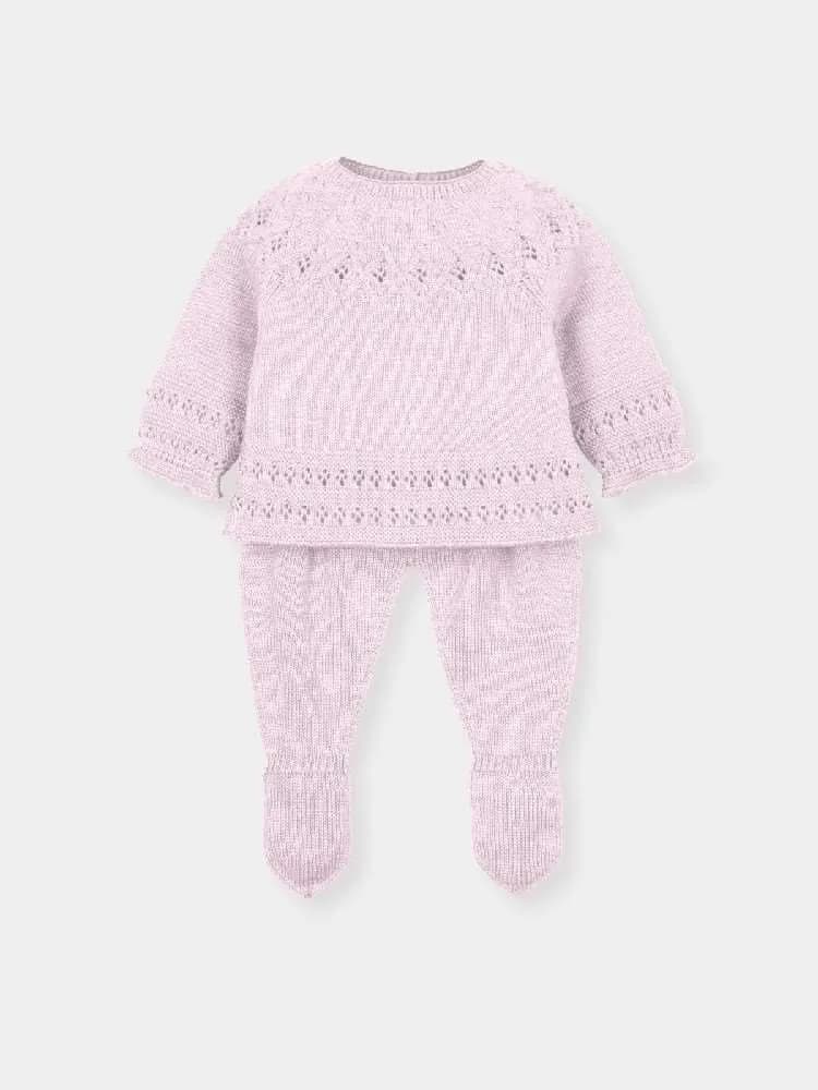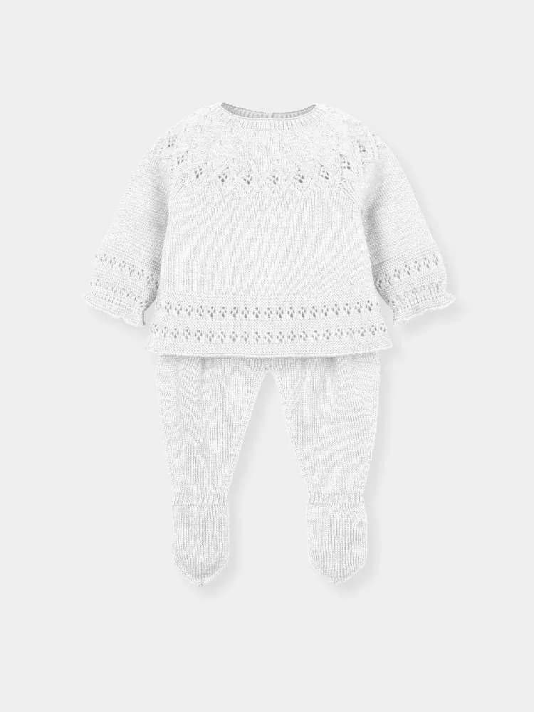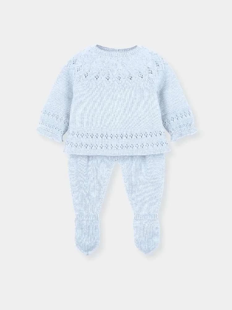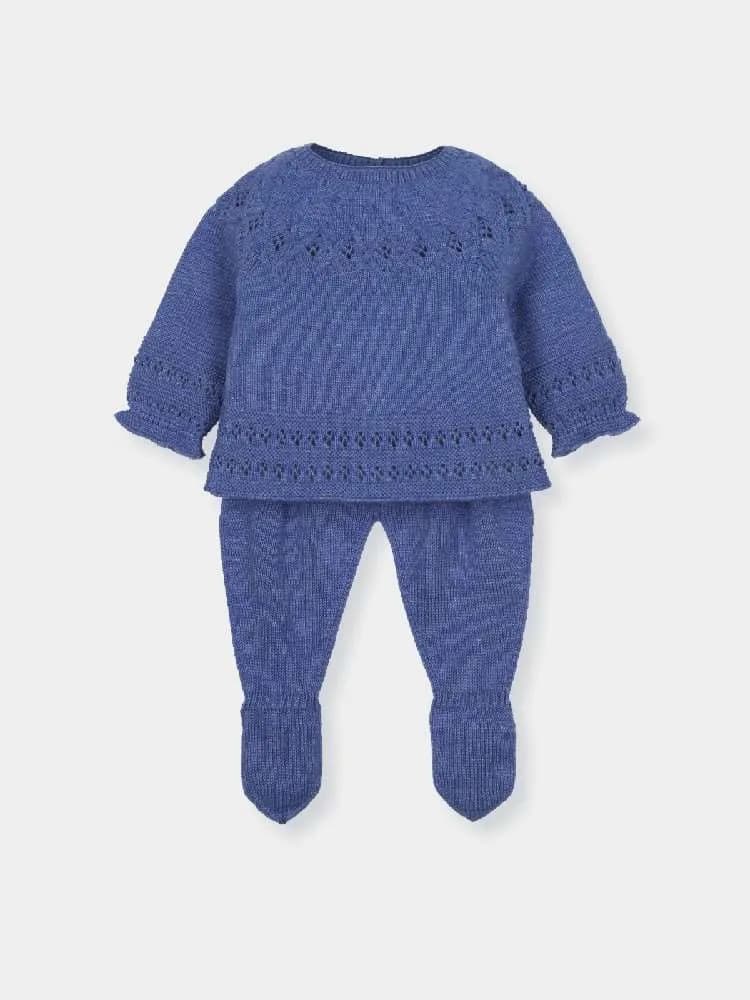Jersey y polaina en punto calado azul índigo con cenefa de rombos en el canesú. Puños con volante sutil. Algodón 100%.