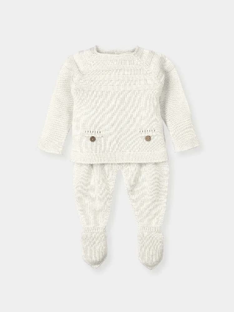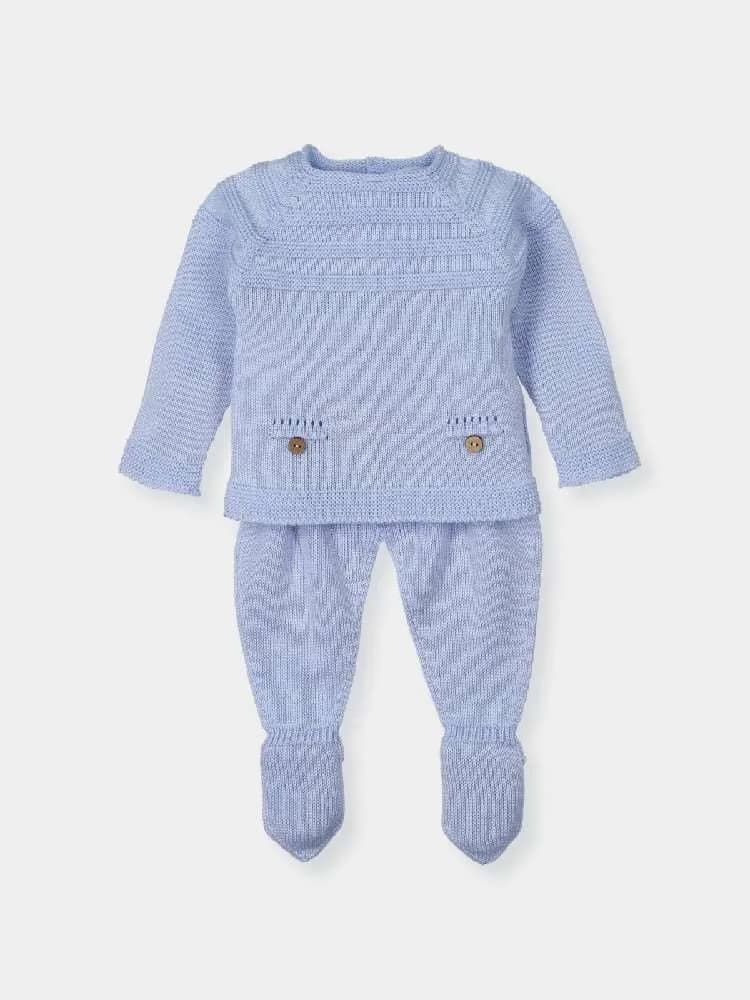 Jersey de punto celeste con canesú a rayas, bolsillos con botones de madera y polaina con pie. Estilo clásico marinero.